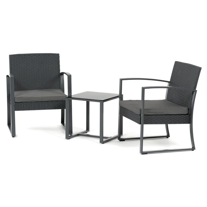 Stolek je doplněn deskou z černého tvrzeného skla, která působí moderně, snadno se čistí a je odolná proti běžnému zatížení. Díky kompaktním rozměrům je tento balkonový set ideální do menších prostor, kde vytvoří příjemné místo pro relaxaci.